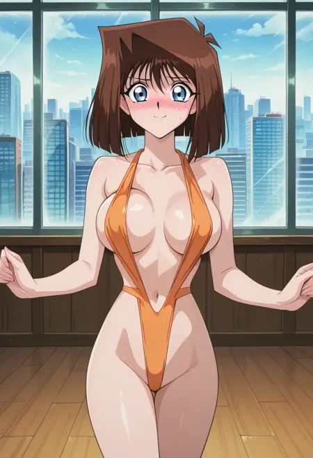 橙色舞蹈装:(橙色弹力单件泳衣,微型单件泳衣,裸颈),(白色平底鞋),