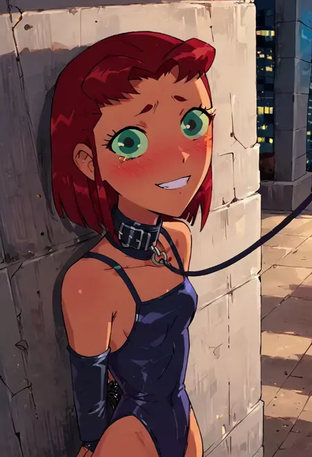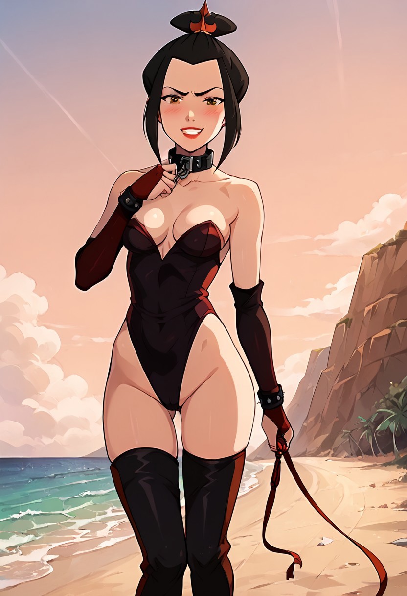 Sex shop outfit: (black, bondage bra,), black collar, (black, bondage panties, unzipped,), black garter straps, black thigh-high boots, black Elbow gloves,
