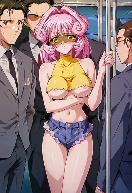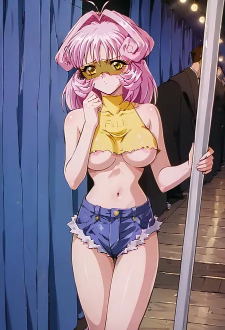 イエローの電車衣装: (イエローのクロップトップ、テキスト「FLLE」、ギザギザの縁、ノースリーブ、アンダーブラ), (デニムショートパンツ、マイクロショート、カットオフ、腰とお腹露出), ブラックのビーサーグラス、レッドのストリッパーヒール,