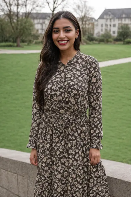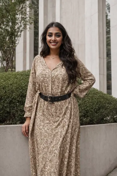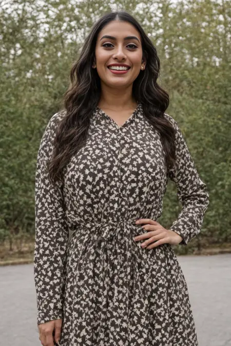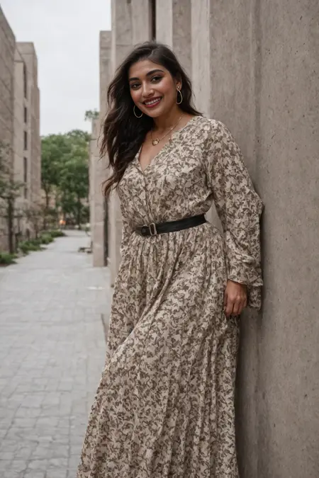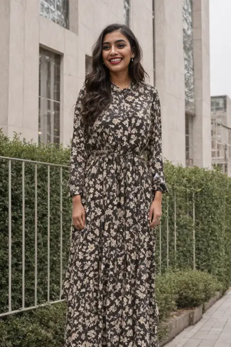 例のプロンプト:長袖{フローラルプリント|ジオメトリックプリント|無地}の{赤|青|緑|ピンク|黒|黄}のダークマキシドレス