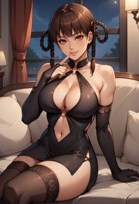 "LeiFangDOA, brown hair, braided hair rings, black dress, o-ring, cleavage, navel cutout, thighhighs, side slit, elbow gloves," for her black dress.