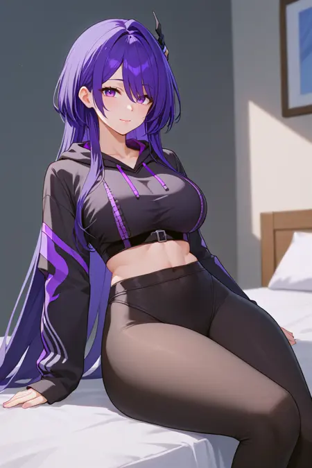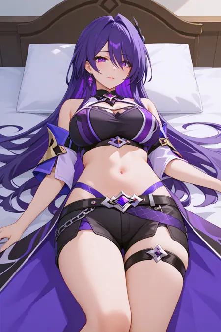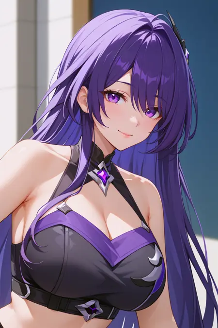 acheron, AcheronBren, 1girl, long hair, purple hair, mature female, purple eyes, bare shoulders, bare_midriff, tall female, medium breasts