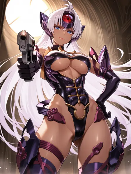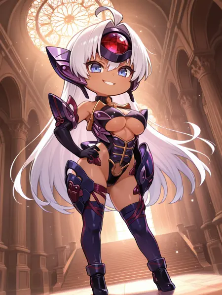 태그(옷 1, 표준): 보라색 하이레그 레오파드, 보라색 이마 보호대, 빨간 허벅지 스트랩, 보라색 허벅지 부츠, 보라색 팔꿈치 장갑