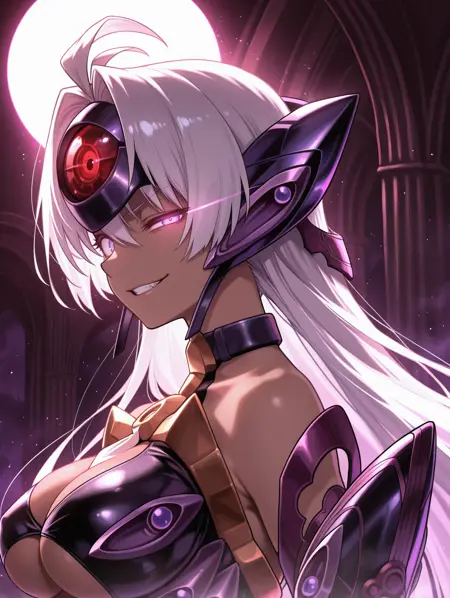タグ(衣装1、標準):紫のハイレグレオタード、紫の額当て、赤い太ももストラップ、紫の太ももブーツ、紫の肘グローブ