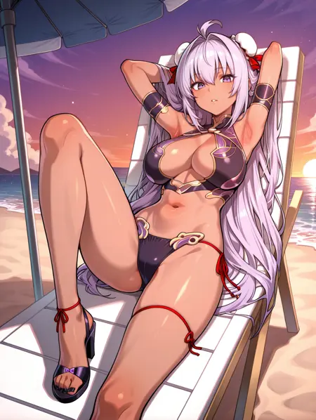 태그(옷 2, 공식 수영복): 연보라색 머리카락, 더블 둥글머리 덮개, 보라색 눈, 보라색 팔찌, 보라색 사이드 타이 수영복, 빨간 허벅지 리본, 보라색 스트랩 힐, 빨간 발목줄