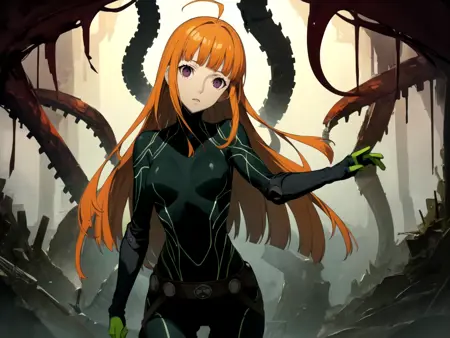 Oracle: dsoracle, オレンジ色の髪, 長い髪, 頂きむきの前髪, あほげ, 紫の目, メガネ, ボディスーツ, 手袋, 頭にゴーグル, ベルト, ネオントリム