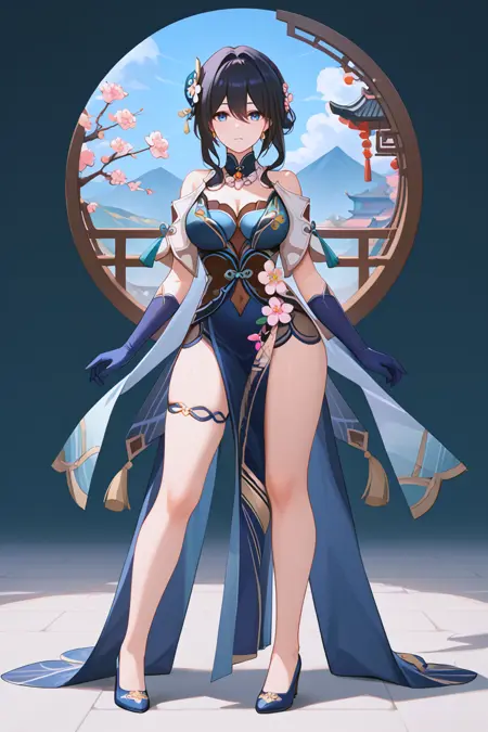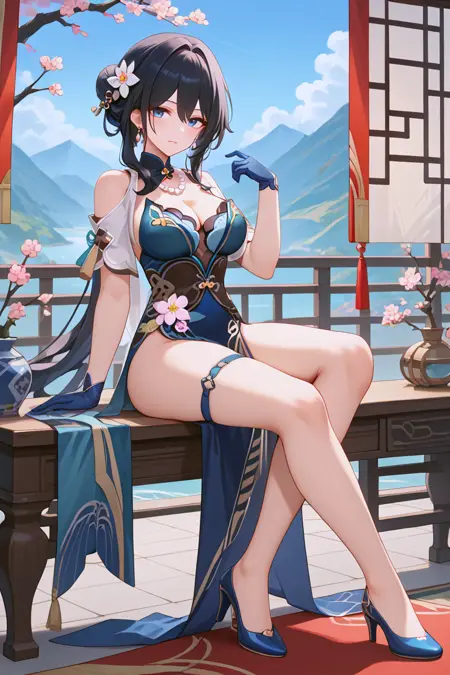 dress, cleavage, flower, hair ornament, jewelry, bare shoulders, chinese clothes, black hair, high heels, china dress, blue gloves, thigh strap, necklace, blue footwear, hair flower, hair bun, bare legs, earrings