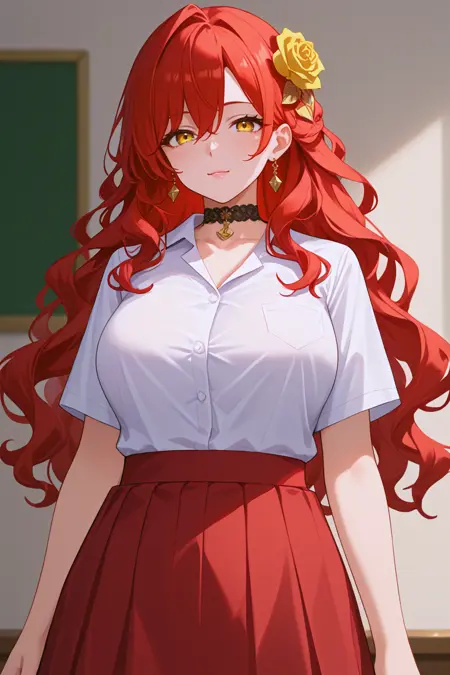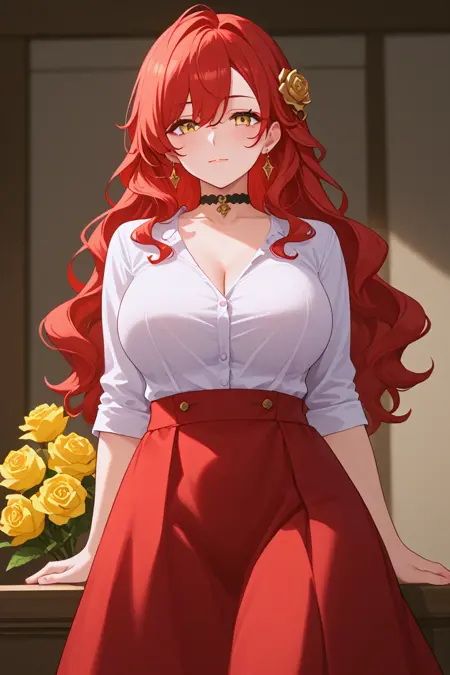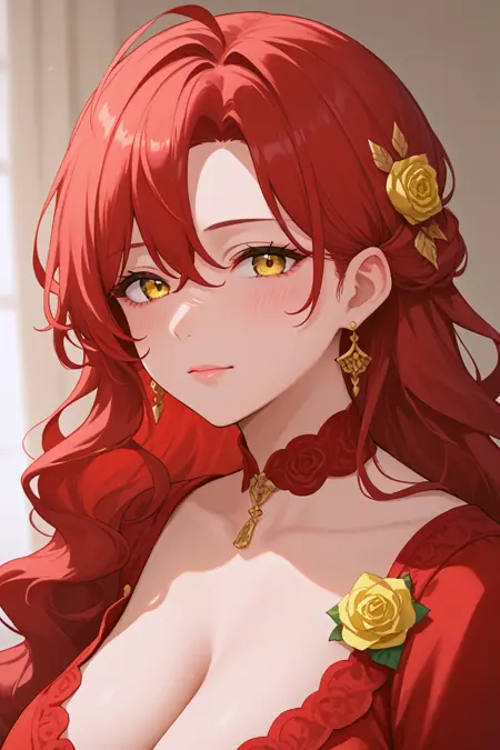 HimekoBren, 1girl, long hair, red hair, yellow eyes, jewelry, mature female, mole on breast, yellow flower, wavy hair, large thighs, milf