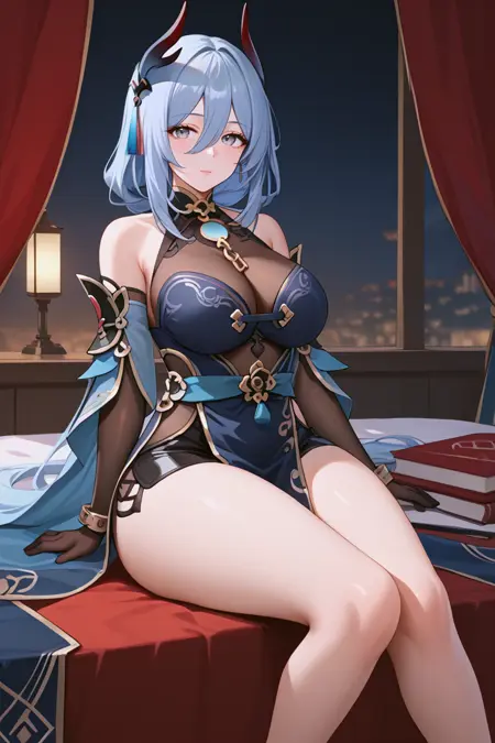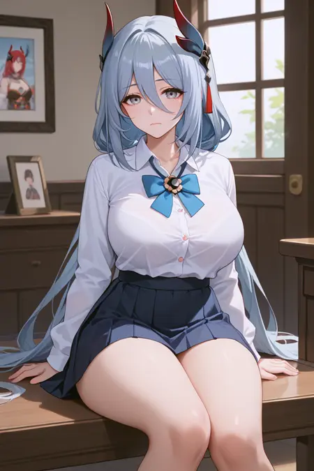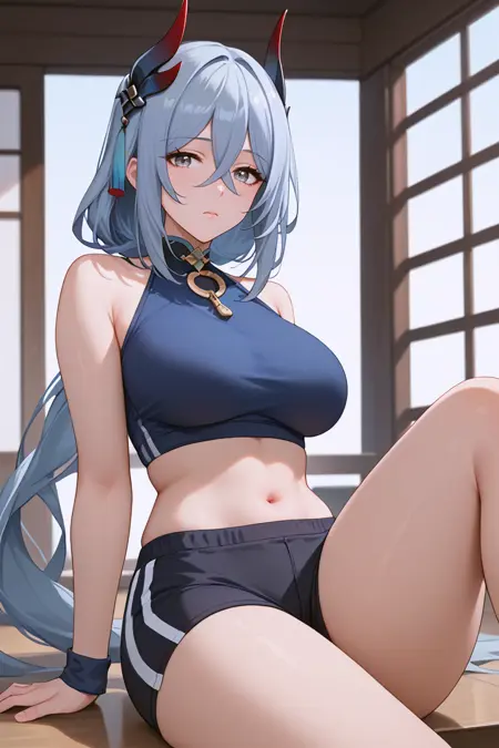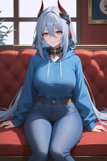 HanyaBren, 1girl, 긴 머리, 회색 머리, 연한 파란 머리, 뿔, 성숙한 여성, 두꺼운 허벅지, 허벅지, 키가 큰 여성, 큰 허벅지, MILF, 큰 가슴