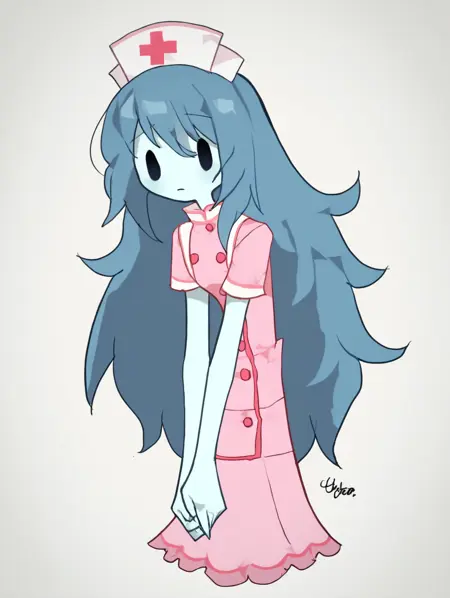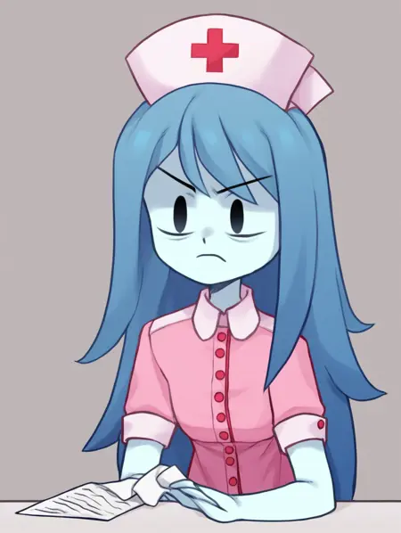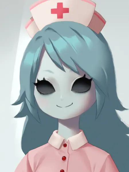 간호사 스포oky: sp00kjsm, 1girl, solo, aqua skin, colored skin, blue hair, long hair, solid oval eyes, black eyes, nurse, nurse cap, nursespooky