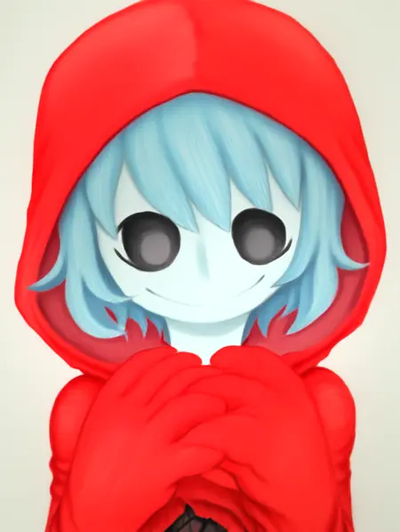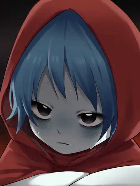 레드 데스 스포oky: sp00kjsm, 1girl, solo, aqua skin, colored skin, blue hair, short hair, solid oval eyes, black eyes, scythe, redeathcostume, red hood