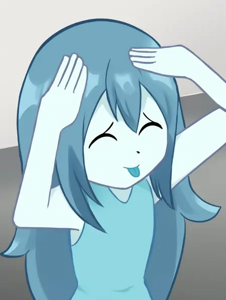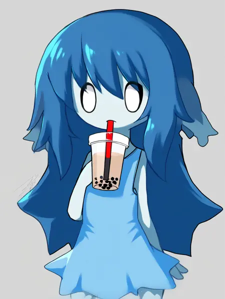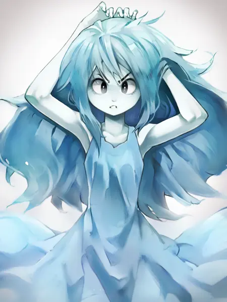 기본 스포oky: sp00kjsm, 1girl, solo, aqua skin, colored skin, blue hair, long hair, solid oval eyes, black eyes, defspooky, lightblue dress, dress