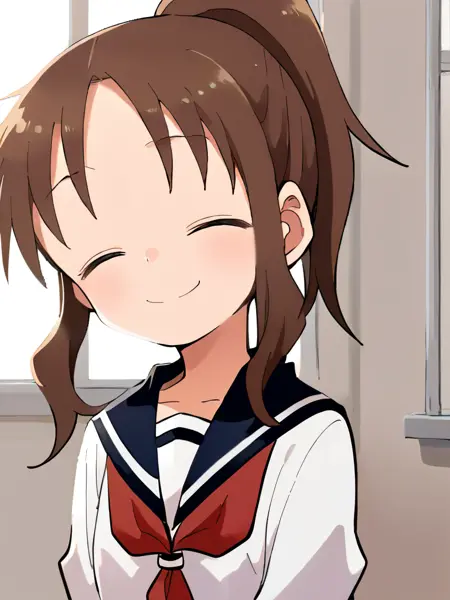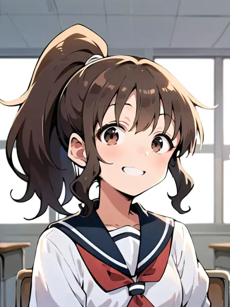 主角:Takagawa Sumire,high ponytail,brown hair,bangs,sidelocks,brown eyes,closed mouth,
