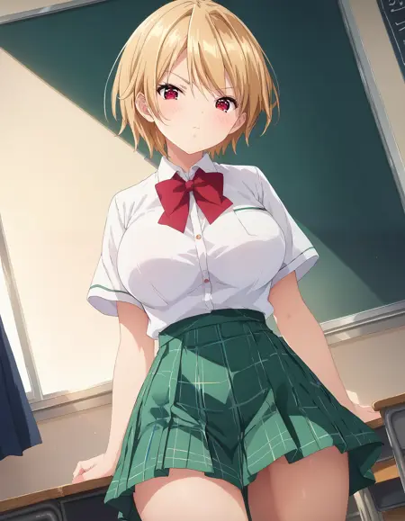 角色:1个女孩,东春,金发,短发,非常短的头发,红眼睛,大乳房,脸红,