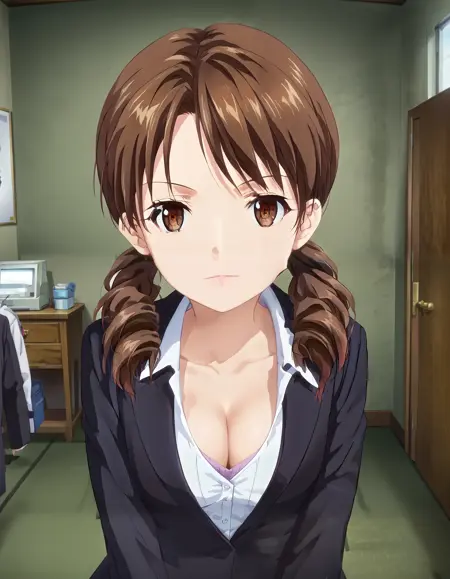 Outfit 2: suit, black suit, white blouse, mini skirt, black skirt, cleavage, collarbone,