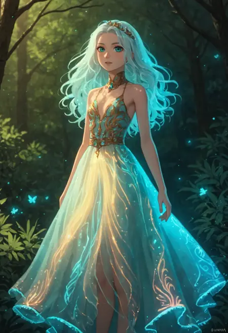 各キャプションは必ず「bioluminescent」または「iridescent」で始めてください。その性質を持つ部分は冒頭のみに記述し、その後には一切言及しないでください(例:「bioluminescent dress」や「iridescent skin」、「glowing shirt」など)。冒頭以外では「glowing(輝いている)」や「bioluminescent(生物発光的)」とは言わないでください。
