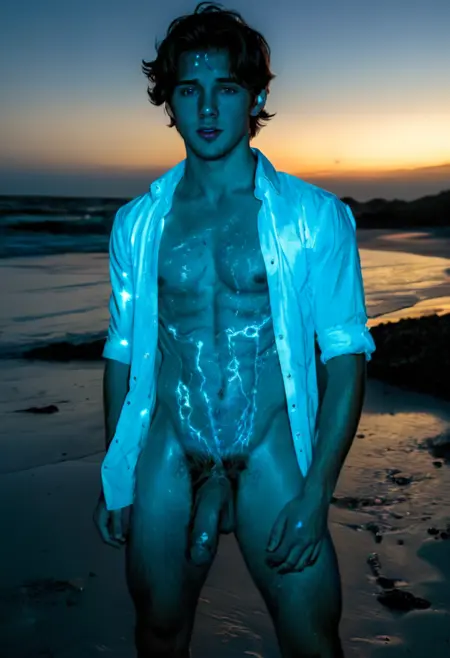Please start each caption with either "bioluminescent" or "iridescent," mentioning the part that has that quality at the beginning and no other point (like "bioluminescent dress," or "iridescent skin," or "glowing shirt," etc.). Don't mention that it's glowing/bioluminescent after the beginning.