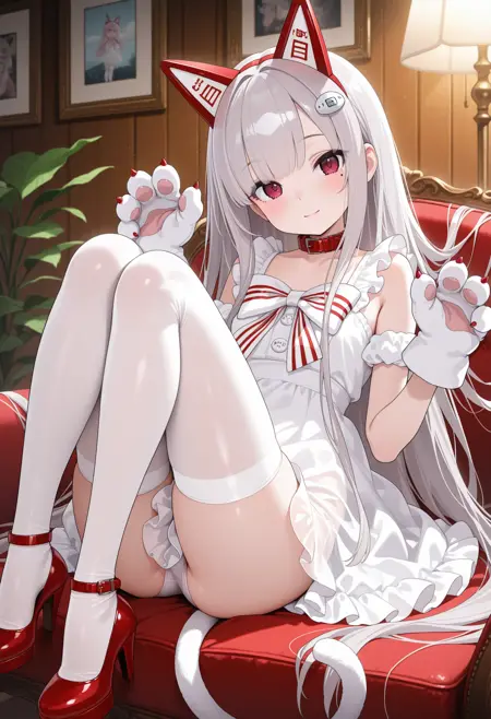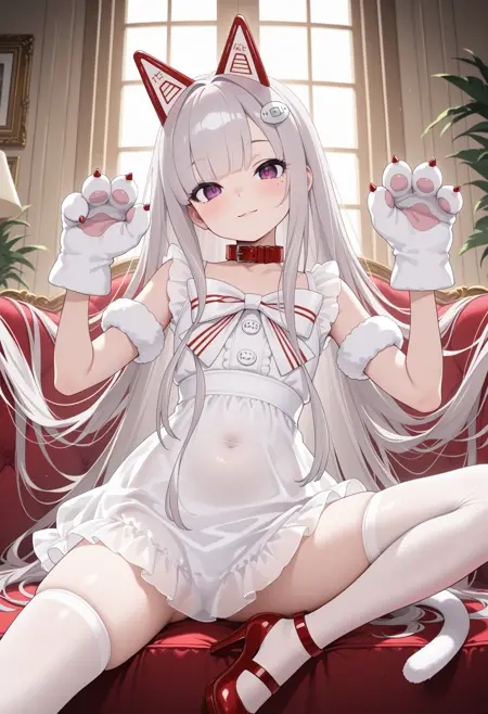 | 학습된 단어 | namahoshi-chan, fake animal ears, cat ears, grey hair, purple eyes, very long hair, bangs, hair ornament, animal ears, mole under eye, cat tail,복사됨! animal hands, paw gloves, thighhighs, red footwear, gloves, ribbon, bow, white thighhighs, see-through, high heels, white dress, shoes, collar,white gloves복사됨! |