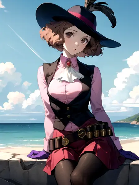 Noir: dsnoir, brown hair, short hair, brown eyes, pink shirt, ascot, skirt, vest, hat, hat feather, pantyhose, bandolier, purple gloves