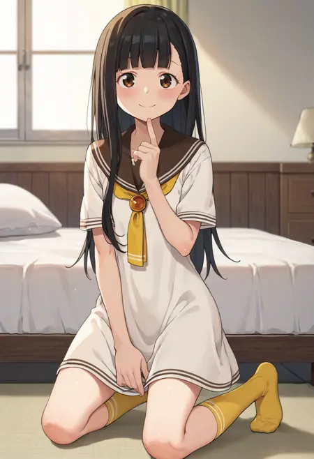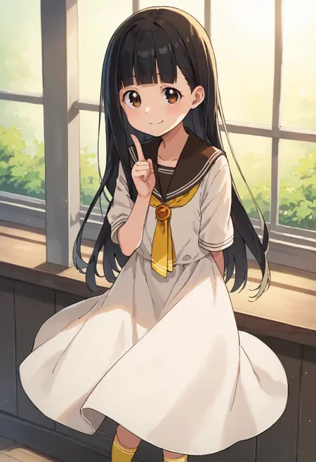 kaju-default,nukumizu kaju, brown eyes,black hair, long hair, blunt bangs,white dress,dress,brown sailor collar,yellow socks,loafers