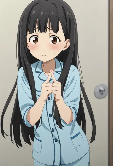 kaju-pajamas, nukumizu kaju, brown eyes,black hair, long hair, blunt bangs,blue pajamas,blue pants