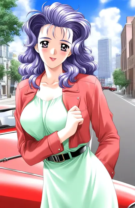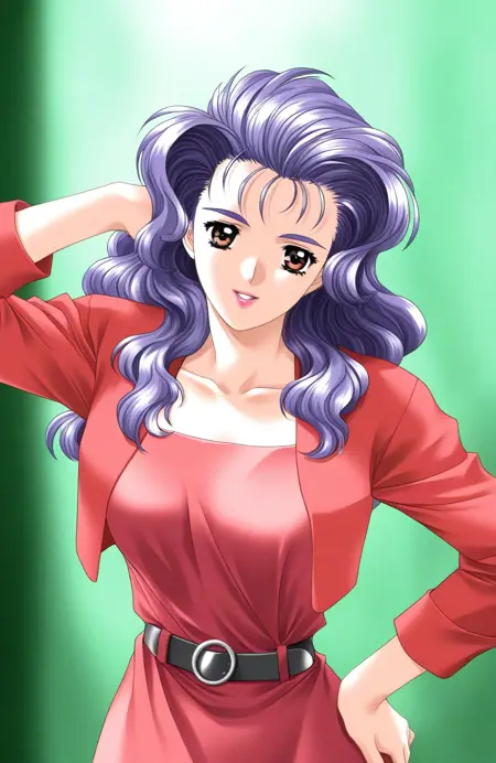 Kusanagi_Yayoi(Doukyuusei), 1girl,solo, 자주색 머리, 곱슬머리, 긴 머리, 갈색 눈, 파란색 머리, 립스틱, 큰 가슴,