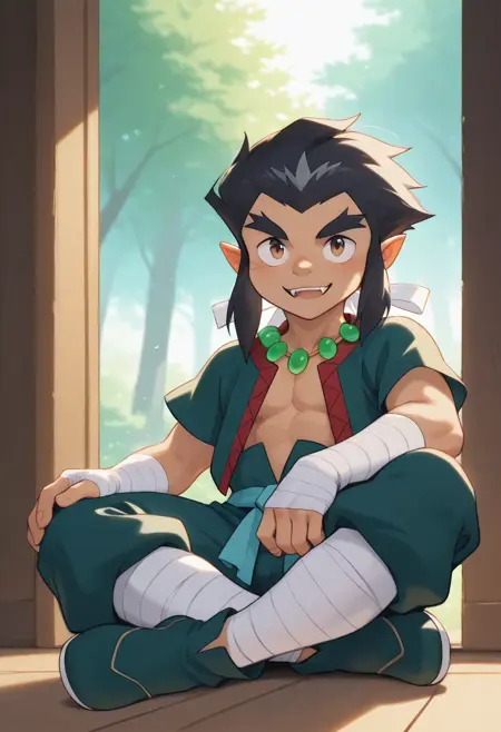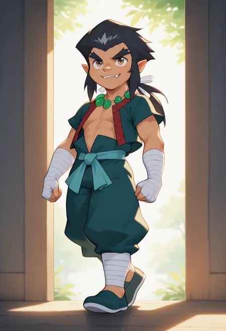 <lora:Lee aka Lai Chen BeyBlade:0.8>,leebb, 1boy, black hair, male focus, solo, red and green open top, jewelry, necklace, white hair ribbon, fangs, green pants, arm bandages, brown eyes, bandages, belt, pointy ears, leg bandages, long hair, thick eyebrows,shoes,simple mouth, smiling, beautiful eyes, shortstack,
