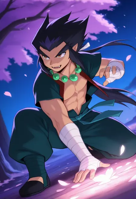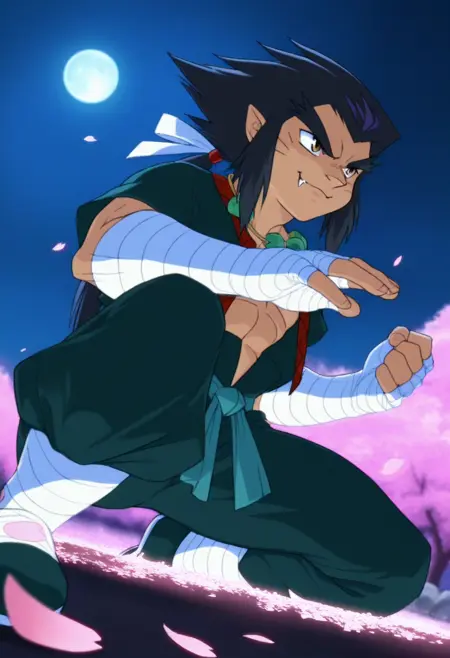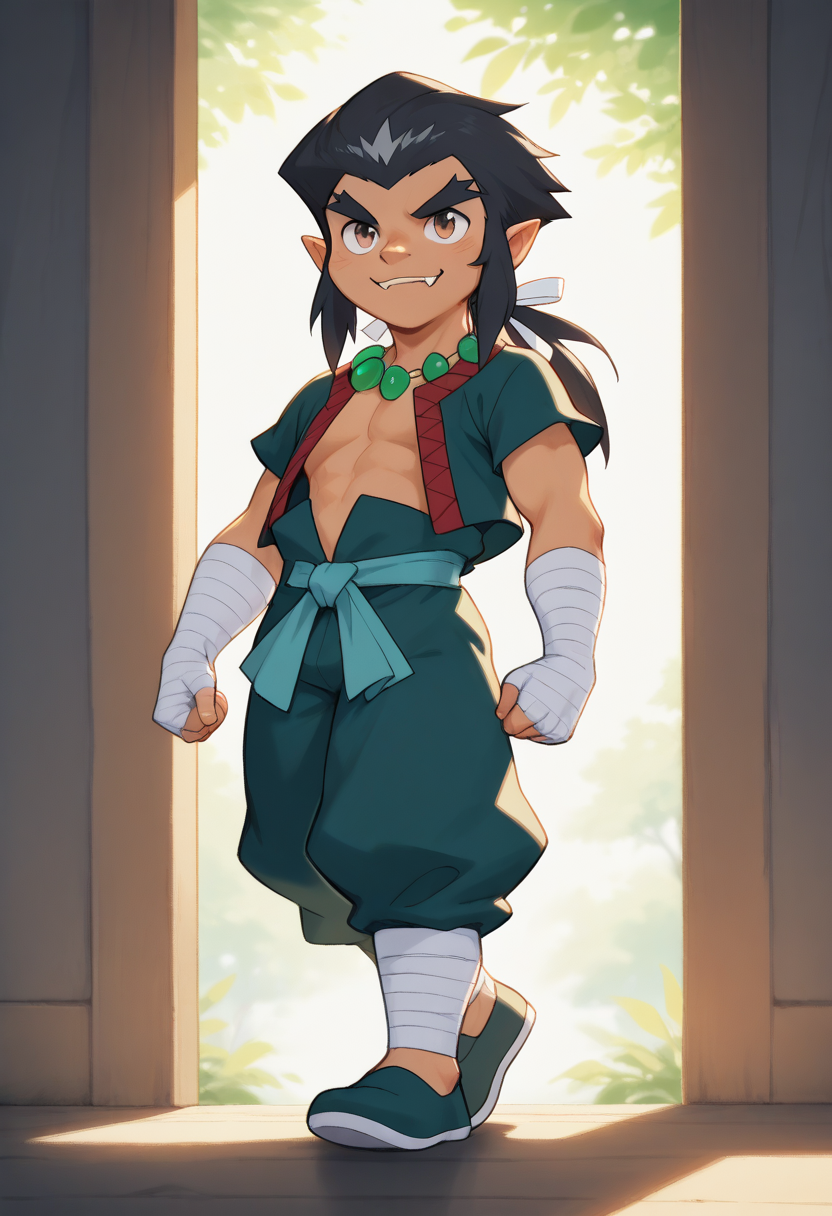 <lora:Lee aka Lai Chen-Illustrious:1>,leebb, 1boy, black hair, male focus, solo, red and green open top, white hair ribbon, jewelry, fangs, necklace, green pants, arm bandages, brown eyes, bandages, belt, pointy ears, long hair, shoes, leg bandages, thick eyebrows, full body,(Male:1.6),smerk,