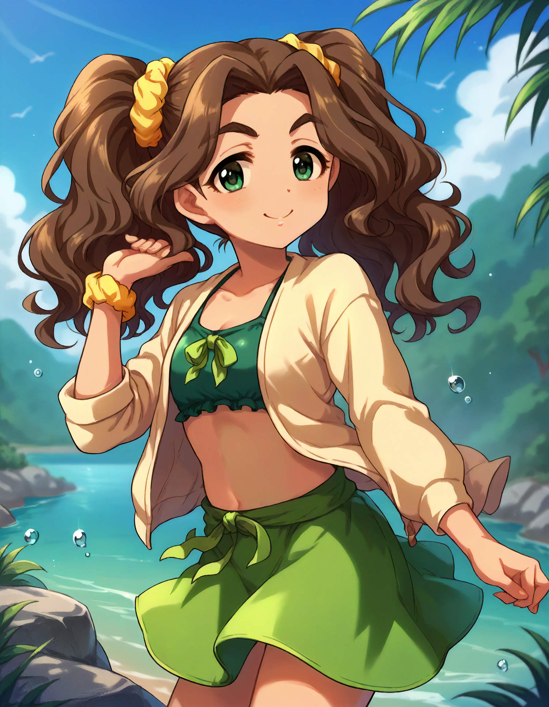 kwhb,brown hair,twintails,wavy hair,thick eyebrows,green eyes