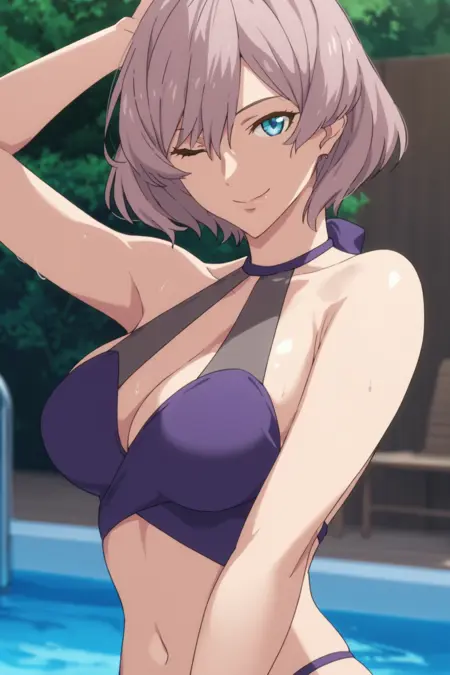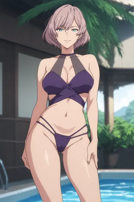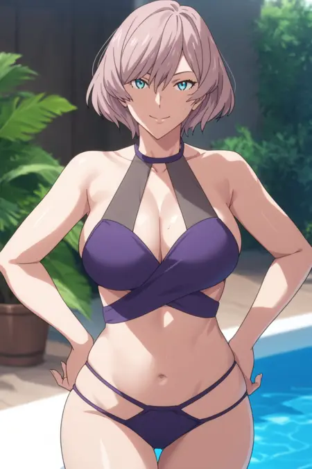 Bikini outfit - mujina, mujinabikini, blue eyes, short hair, purple hair, purple bikini, cleavage