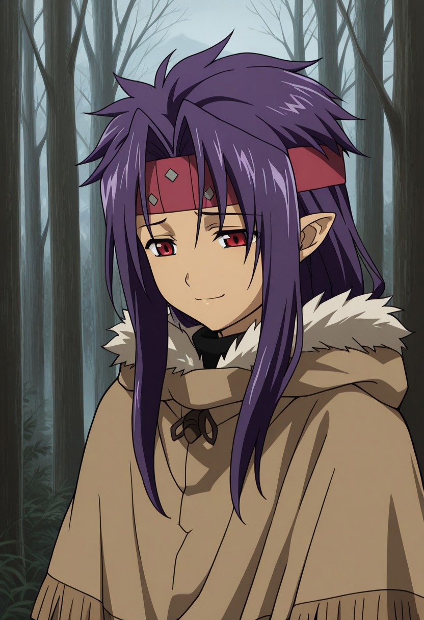 chrno, 1boy, 男性焦点, ソロ, 暗い肌, 暗い肌の男性, 尖った耳, 赤い目, ヘッドバンド, 紫色の髪, 長髪, ポンチョ, ファーのトリム, シャツ, 黒いシャツ, 長袖, パンツ, 黒いパンツ,