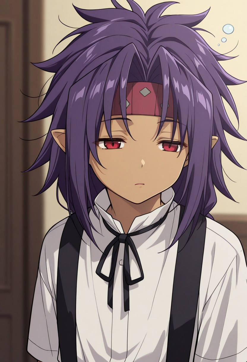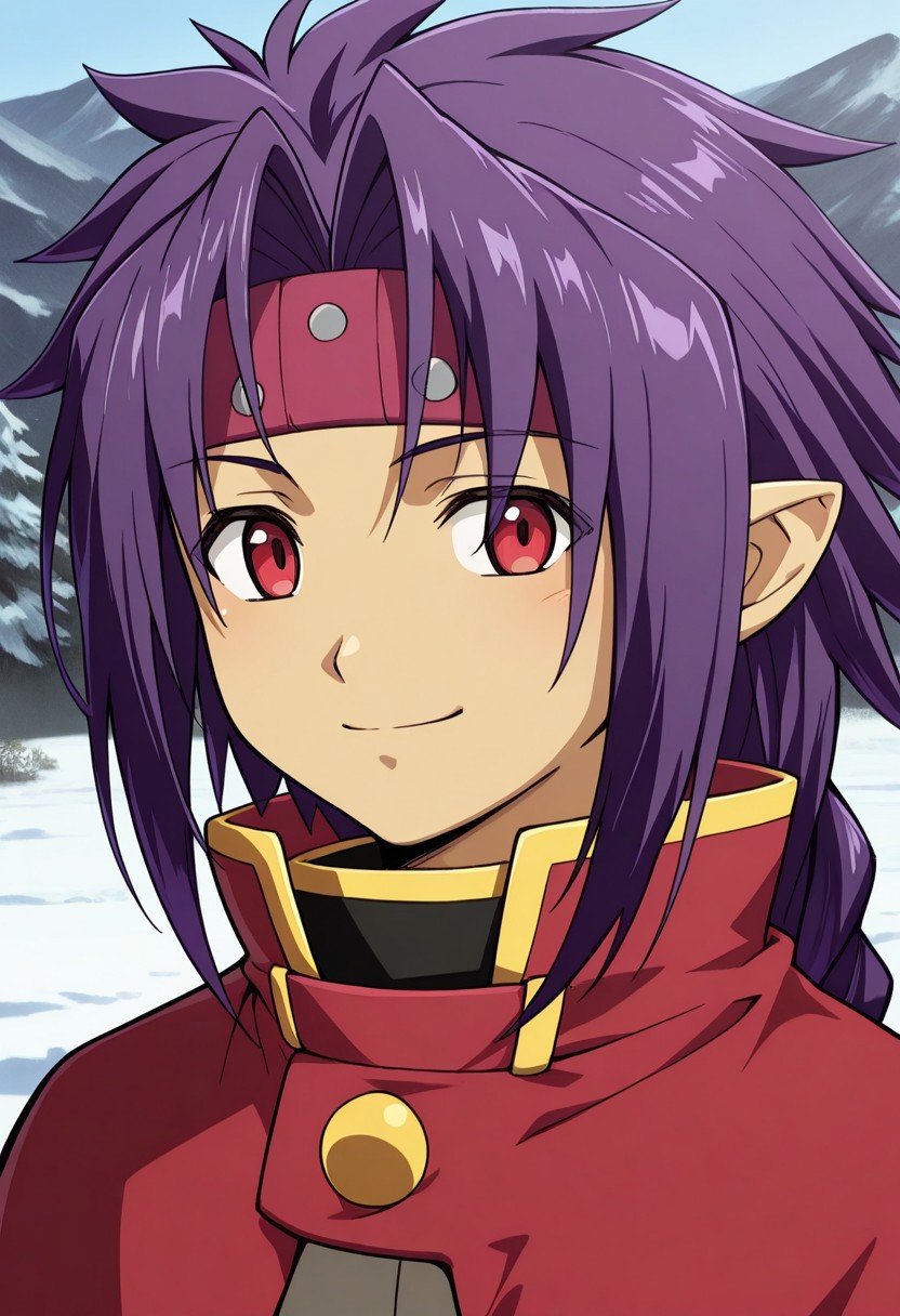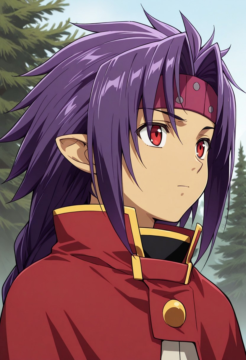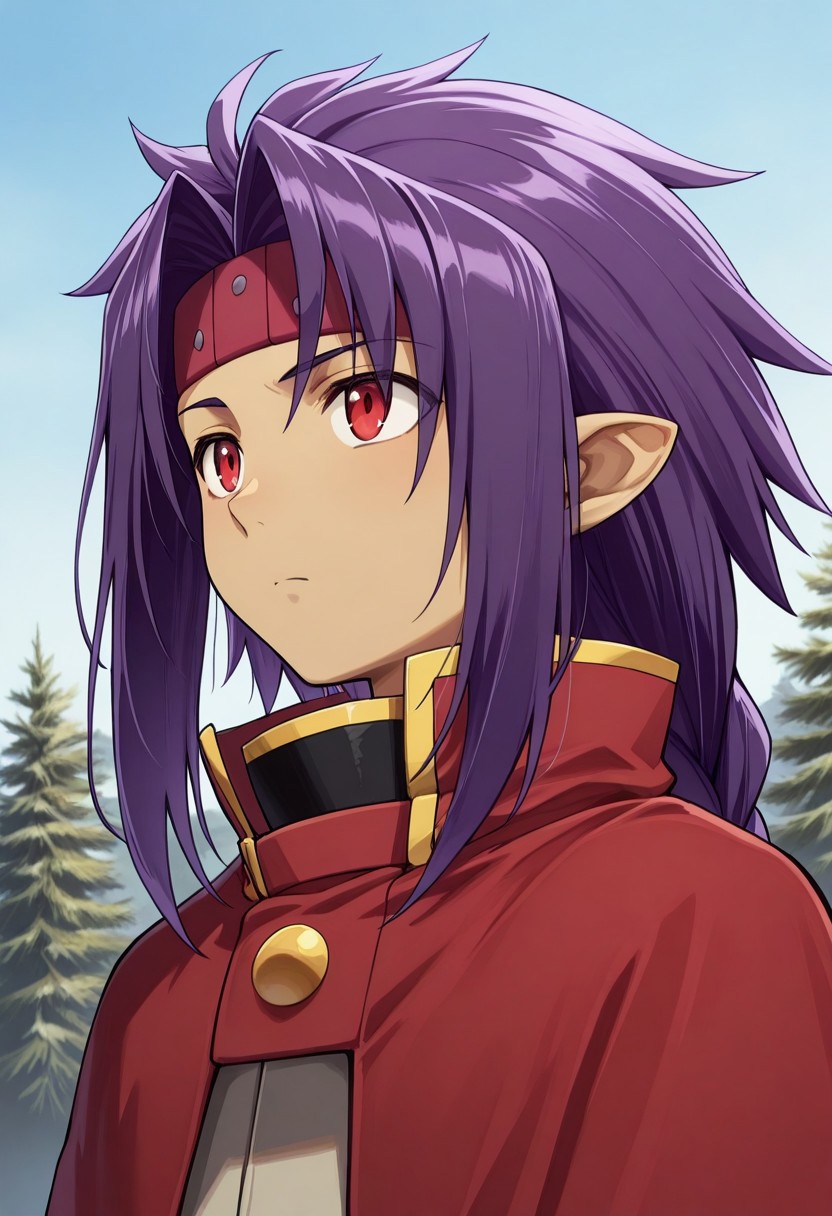 chrno, バンドゥ, 1boy, 長髪, 男性焦点, 赤い目, ヘッドバンド, 紫色の髪, コート, 単一のバントゥ, ケープレット, 尖った耳, シャツ, 白いシャツ, タイルコート, 赤いタイルコート, 赤いケープレット, 暗い肌, 暗い肌の男性, タイツ, 黒いタイツ, ソックス, 白いソックス, 茶色の靴, ショートパンツ, 赤いショートパンツ, ボウ, 黄色のボウ,