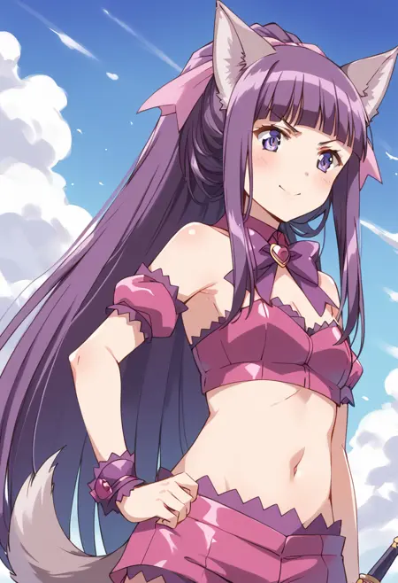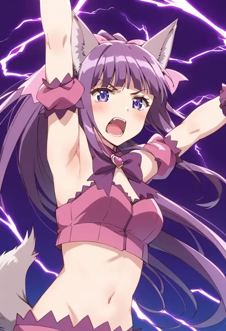 mew zakuro, purple hair, blunt bangs, ponytail, sidelocks, very long hair, purple eyes, blue eyes, eyelashes, wolf ears, animal ear fluff, pink bow, hair bow전신