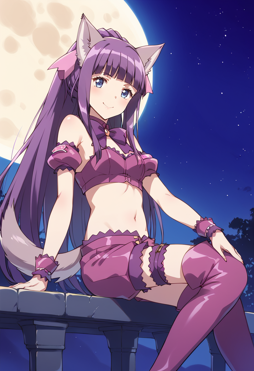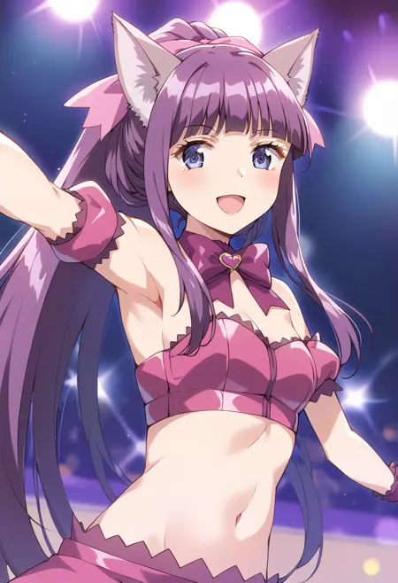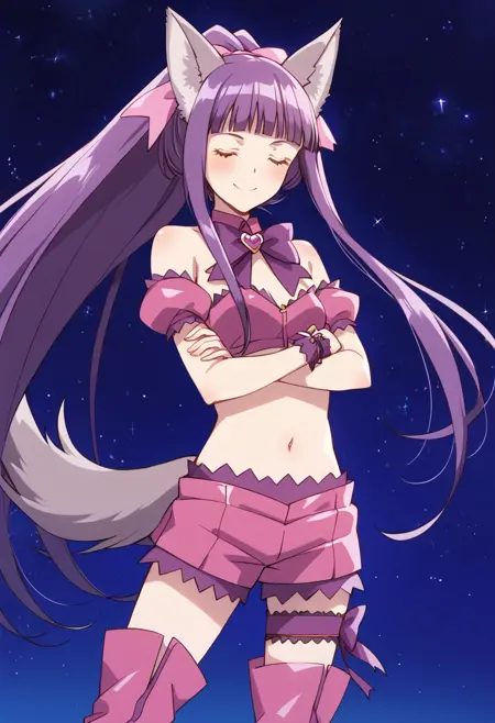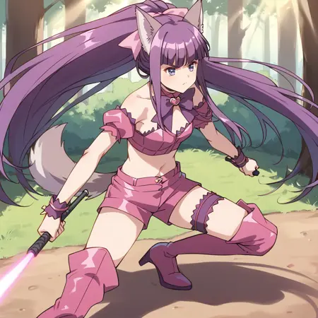mew zakuro, purple hair, blunt bangs, ponytail, sidelocks, very long hair, purple eyes, blue eyes, eyelashes, wolf ears, animal ear fluff, pink bow, hair bow, strapless, crop top, bandeau, tube top, brooch, pink choker, purple neckwear, purple bowtie, puffy detached sleeves, arm garter, wrist cuffs, short shorts, purple shorts, bridal garter, wolf tail, purple footwear, thigh boots, bare shoulders, navel, midriff