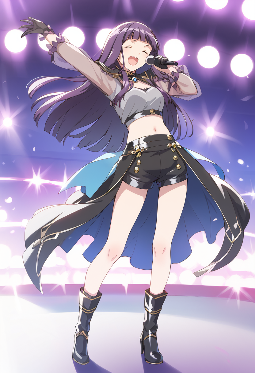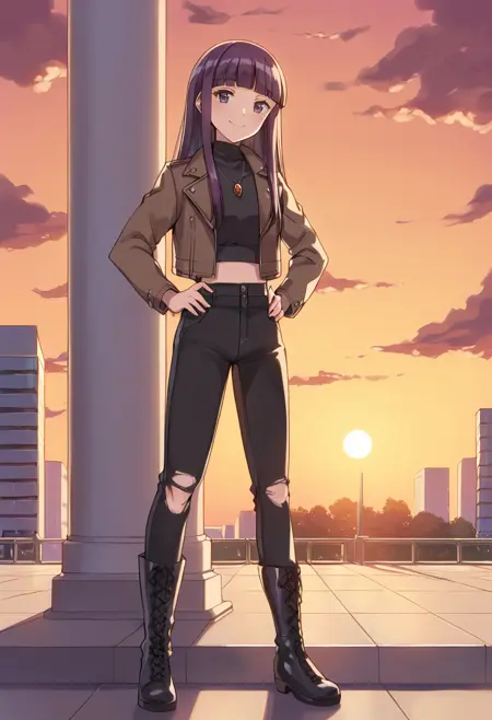 fujiwara zakuro, purple hair, blunt bangs, sidelocks, hime cut, straight hair, long hair, blue eyes, purple eyes, eyelashes, brown jacket, open jacket, cropped jacket, turtleneck, black shirt, black pants, high-waist pants, torn pants, knee boots, black footwear, necklace, midriff일상복 패턴 2