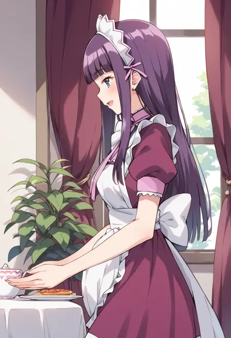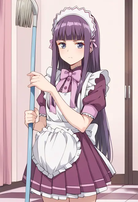 fujiwara zakuro, waitress, purple hair, blunt bangs, sidelocks, hime cut, straight hair, long hair, blue eyes, purple eyes, eyelashes, purple dress, frilled dress, purple skirt, pleated skirt, puffy short sleeves, maid headdress, hair ribbon, pink ribbon, maid apron, white apron, frilled apron, pink bowtie, purple neckwear, frills, pink socks, black footwear, boots