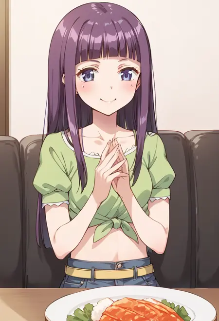 fujiwara zakuro, purple hair, blunt bangs, sidelocks, hime cut, straight hair, long hair, blue eyes, purple eyes, eyelashes, green shirt, tied shirt, puffy short sleeves, collarbone, midriff, pants, denim, jeans, yellow belt, sneakers, black footwear카페 뮤우뮤우 유니폼