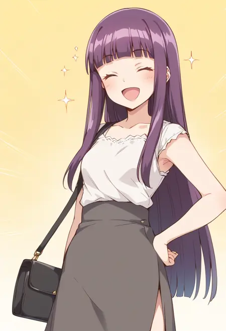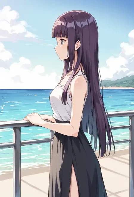 fujiwara zakuro, purple hair, blunt bangs, sidelocks, hime cut, straight hair, long hair, blue eyes, purple eyes, eyelashes私服その1