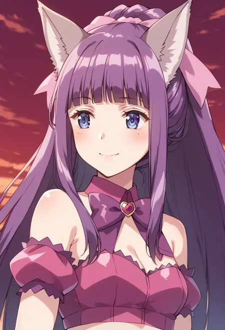 mew zakuro, purple hair, blunt bangs, ponytail, sidelocks, very long hair, purple eyes, blue eyes, eyelashes, wolf ears, animal ear fluff, pink bow, hair bow全身