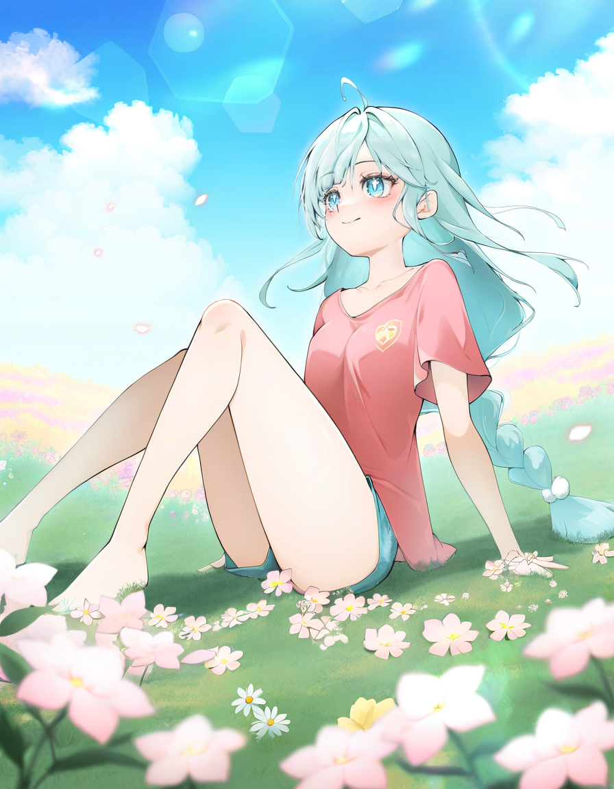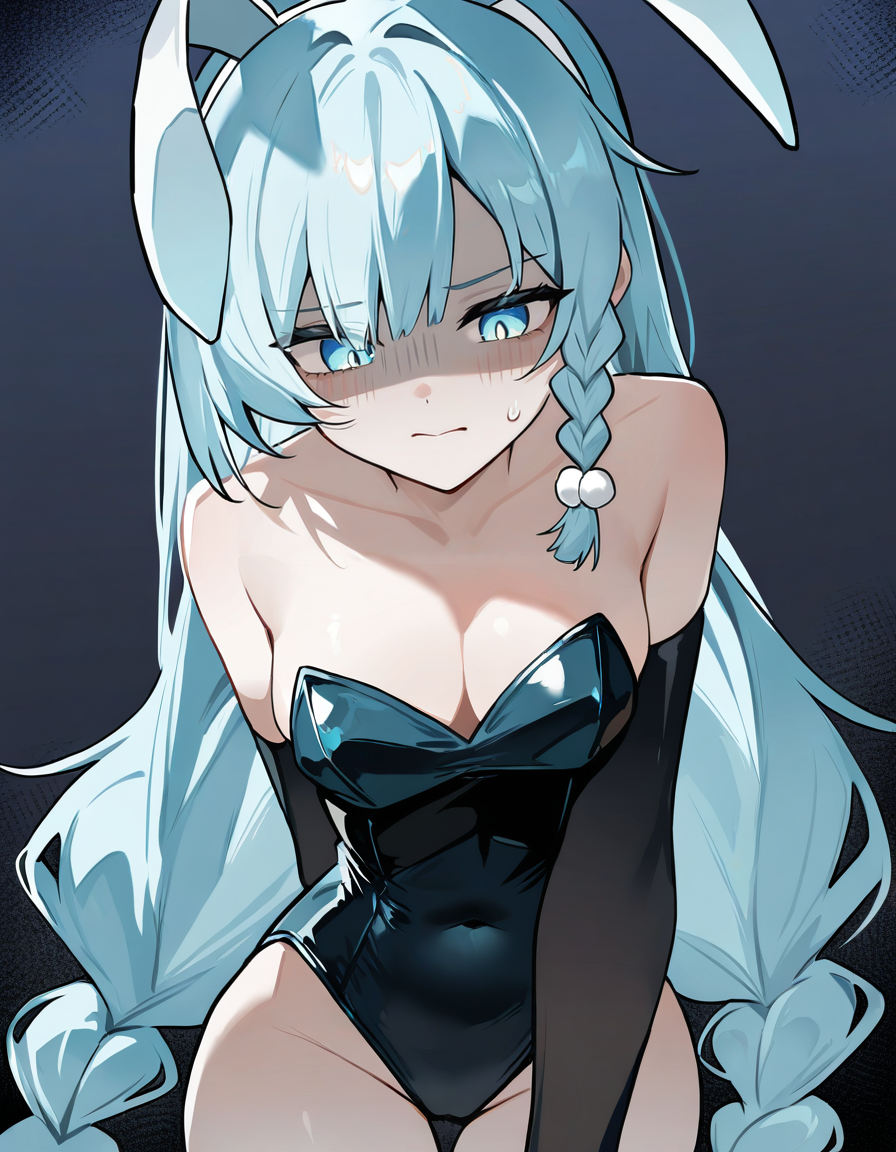 yuebai02,1girl,solo,blue hair,long hair,blue eyes,braid,bow,white bow,pink shirt,apron,puffy sleeves,