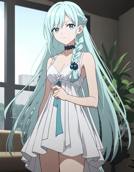 yuebai01,1girl,solo,long hair,braid,blue eyes,blue hair,gloves,white gloves,hat,choker,black choker,dress,white dress,bag,beret,capelet,elbow gloves,pantyhose,
