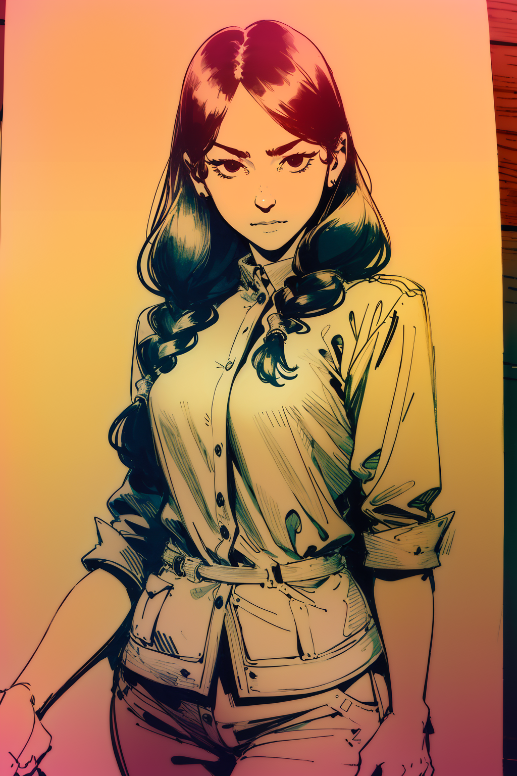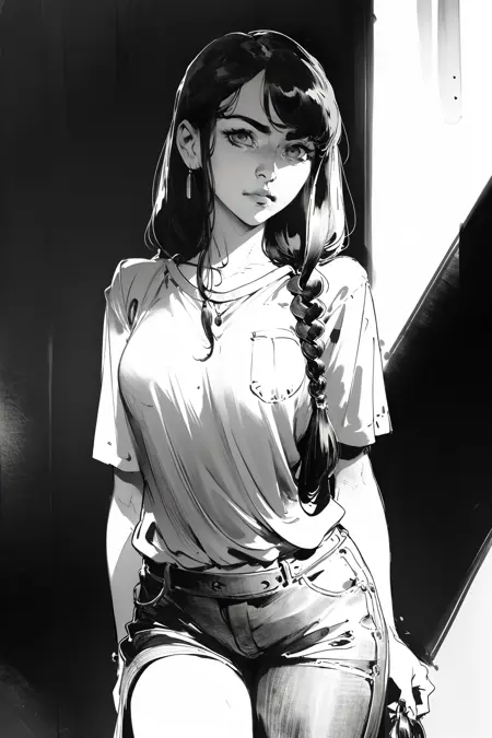 Prompts: (monochrome), sketch, (hand well), (finger well), (long braided hair), (bangs), with in frame, ultra-detailed, 8k, masterpiece, beautiful detailed face, ((no texts)), no names, (volumetric lighting), beautiful detailed eyes, (ambient light), realistic shadows, (fullbody:1), (1girl), (cowboy shot), shirts, pants, looking at viewer, perfect body, body well:1, leg well:1, arm well:1 , (GoodhandsV3)