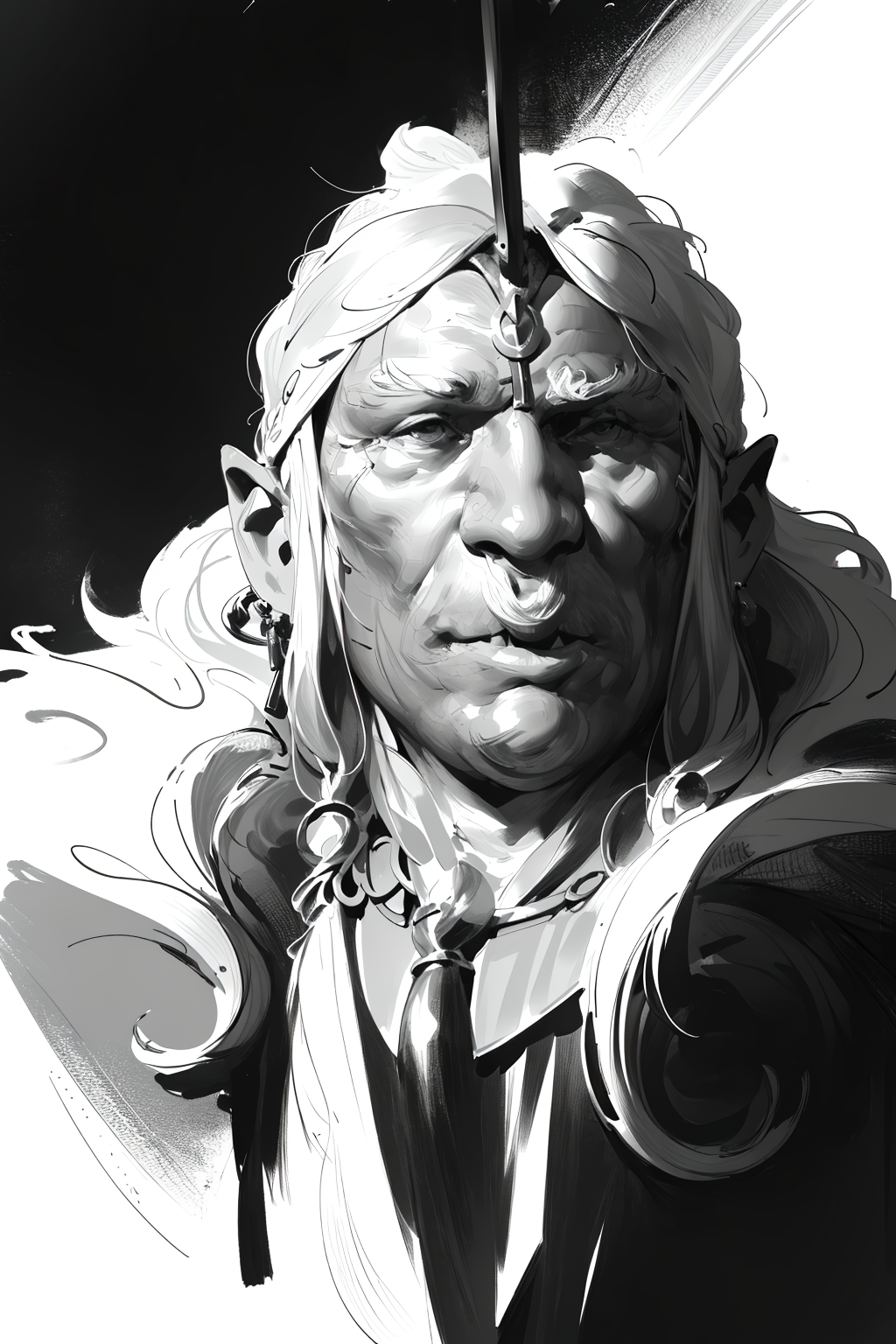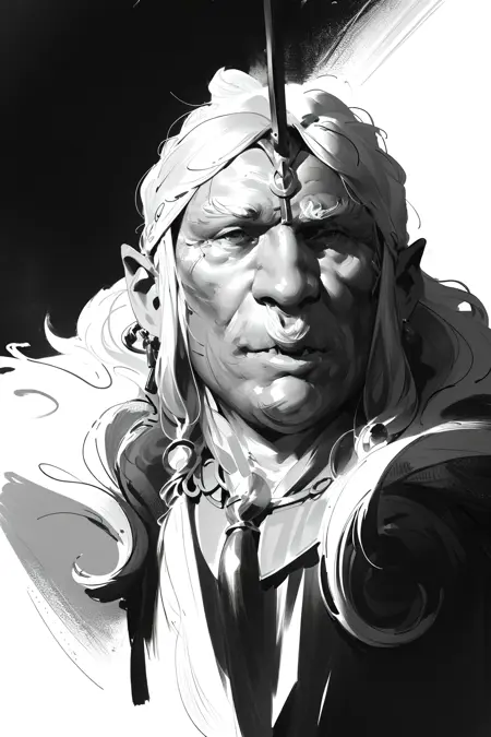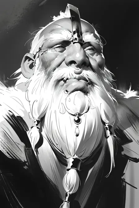 Prompts: (monochrome), sketch, ((old man with large beard as barbarian king)), (male), (hand well), (finger well), (long white hair), with in frame, ultra-detailed, 8k, masterpiece, detailed face, ((no texts)), no names, distance shot, (volumetric lighting), detailed eyes, (ambient light), realistic shadows, body well:1, leg well:1, arm well:1 , (GoodhandsV3)