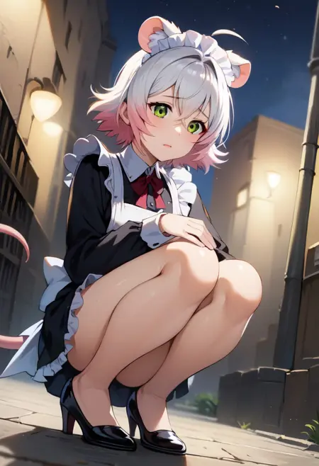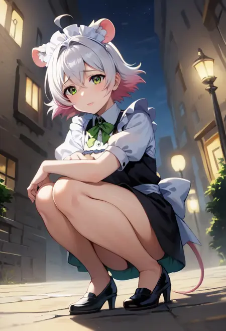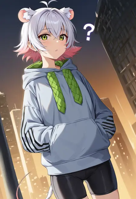 提示:老鼠耳朵、动物耳朵绒毛、白发、粉发、双色发、短发、刘海、头发遮住眼睛、绿眼、呆毛、老鼠尾巴,