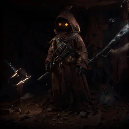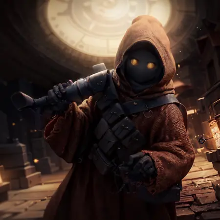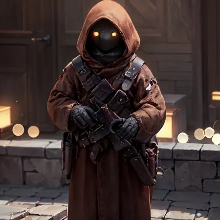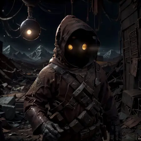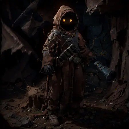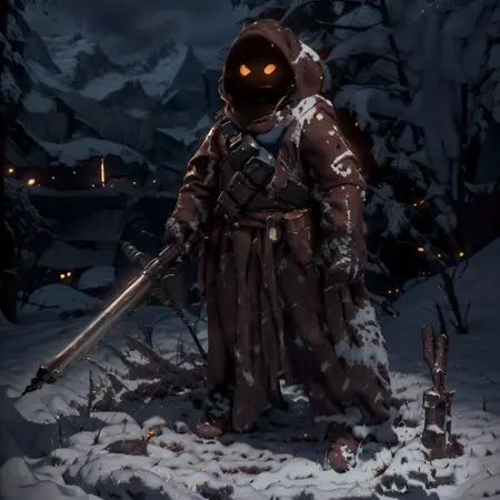此LoRA有点敏感,训练时使用了几张无兜帽的贾瓦人图像以及几张贴白色长袍的图像(用于雪地星球),但似乎并不愿意使用这些设定。稍后将更新修复这些问题。