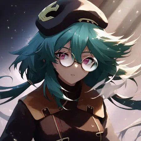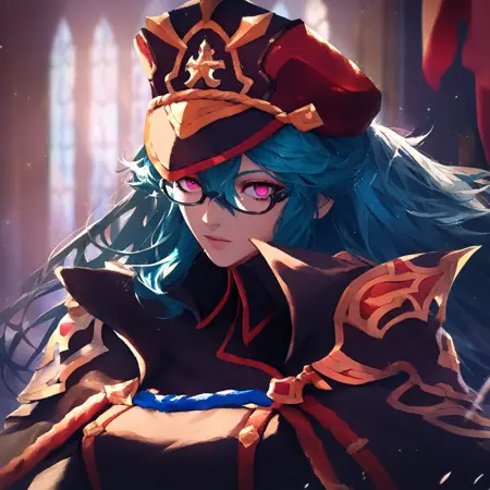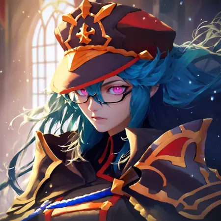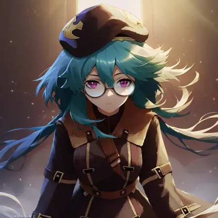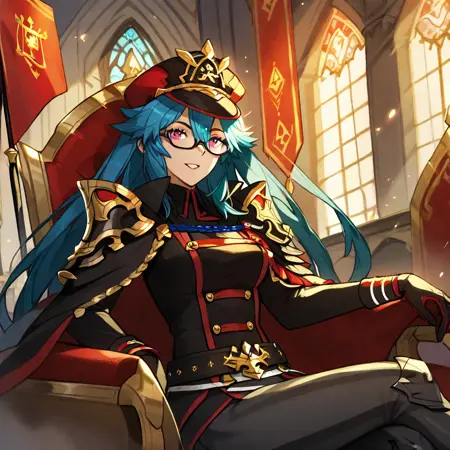 Default version: Kirsty, long hair, blue hair, hair between eyes, pink eyes, hat, glasses, military uniform, gloves, belt, trousers, boots, high heel boots, cape