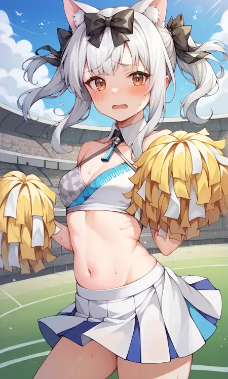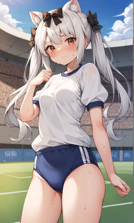 appearance: yukikaze, brown eyes, cat ears, white hair, long hair, twintails, black bow, hair bow