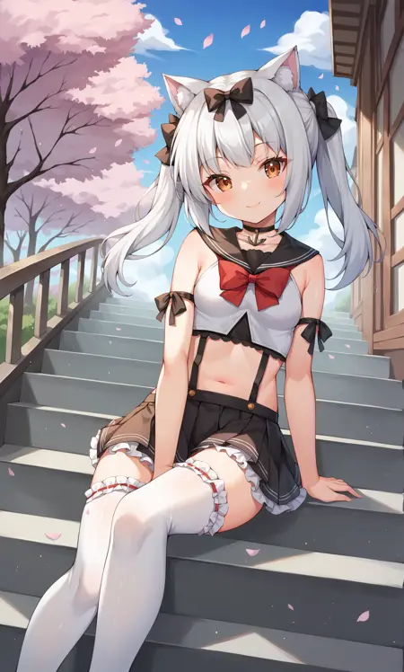 outfit: white shirt, crop top, sleeveless shirt, arm ribbon, black ribbon, anchor choker, black serafuku, red bowtie, suspenders, suspender skirt, black skirt, pleated skirt, white thighhighs, ribbon-trimmed legwear, frilled legwear, shoes, footwear