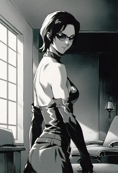 显著标签包括:city、scenery、fedora、trenchcoat、collared shirt、necktie、sunglasses、bare shoulders、backless outfit、elbow gloves、holding gun、handgun、aiming