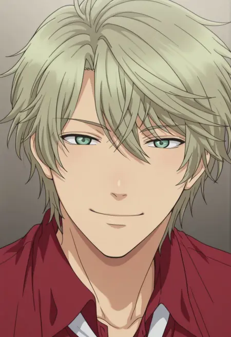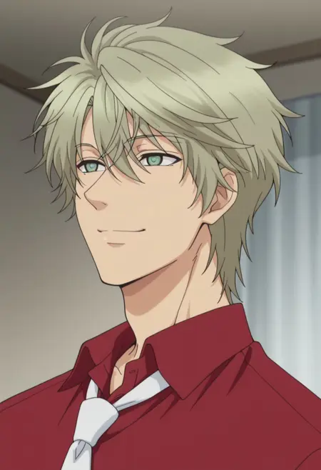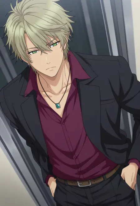 harukaido, 1boy, male focus, green eyes, jewelry, necklace, shirt, formal, red shirt, collared shirt, blonde hair, jacket, black jacket
